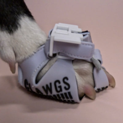 If your size 1-6 Clawgs' front edge extends beyond front (middle) pads while your dog is standing, feel free to cut a slit between the front pads and side claws without risking return rejection.