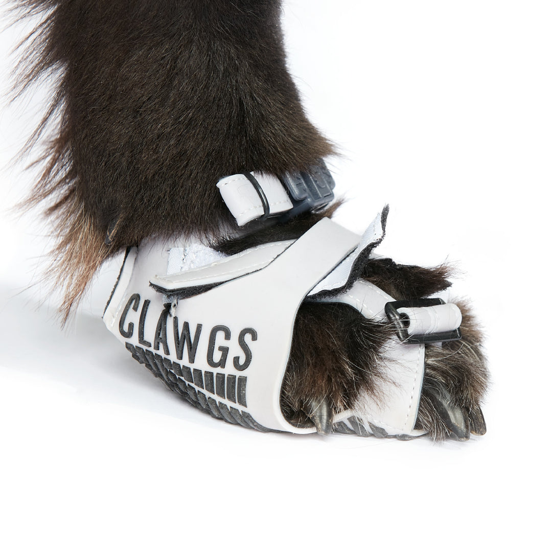 Clawgs V2’s buckles' are larger and rest on side straps, which rest on paw tops.