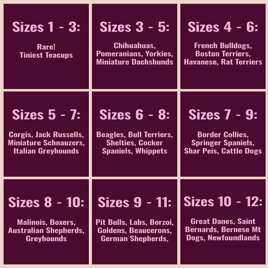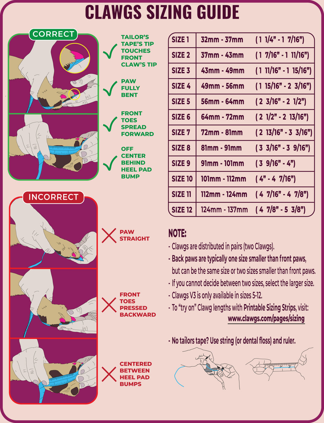 Sizes are determined by matching paw lengths to Clawg lengths, which places Clawgs’ front edge between dogs’ front (middle) toes’ front pads' ground contacting area but does not contact front (middle) claws while paws are fully bent to their standing position with front toes spread as far forward as possible.