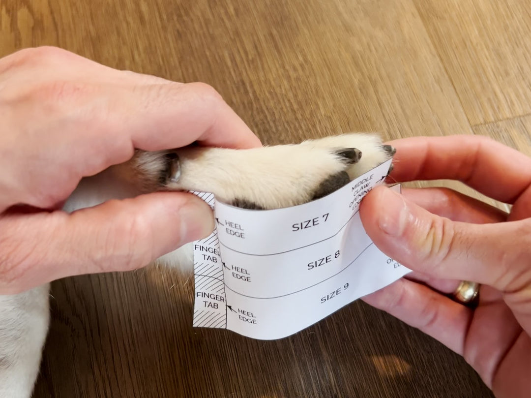 When measuring with the printable sizing strips, please select the longest sizing strip that does not contact claw tips but does fully cover the front toes’ paw pads while following the above measurement instructions.