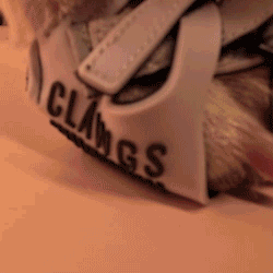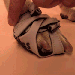 To do this, push Clawgs' heel straps down on paws until the paws' sides' bones' prevent the heel straps from sliding further down.