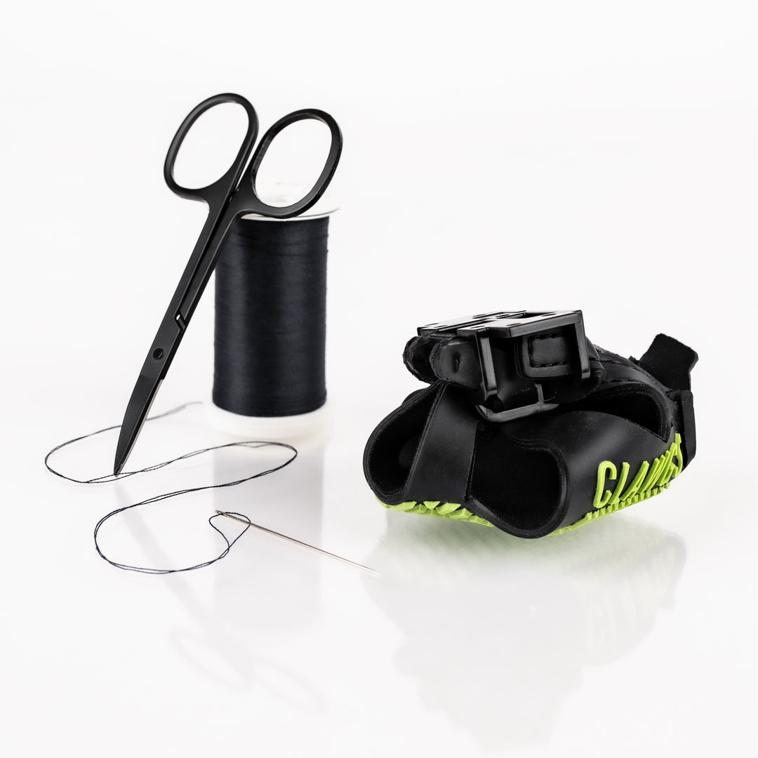 When you're confident that your Clawgs are tightened correctly for your dog, you can hand stitch the excess front toe straps to the excess side toe straps. Then, trim the excess straps to create a prettier looking pair.
