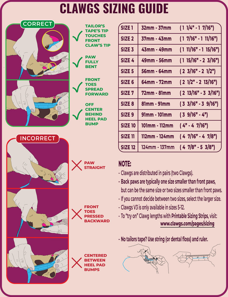 It's unlikely that you'll tighten straps the same for front paws and back paws, even if your dog wears the same size Clawgs on all paws. Selecting different colored Clawgs for one dog is an easy way to identify the Clawgs that are tightened to fit your dogs' front paws and the Clawgs that are tightened to fit your dogs' back paws.